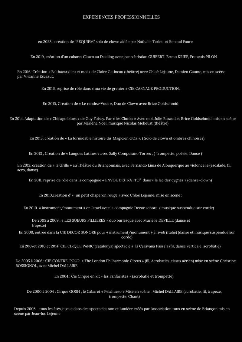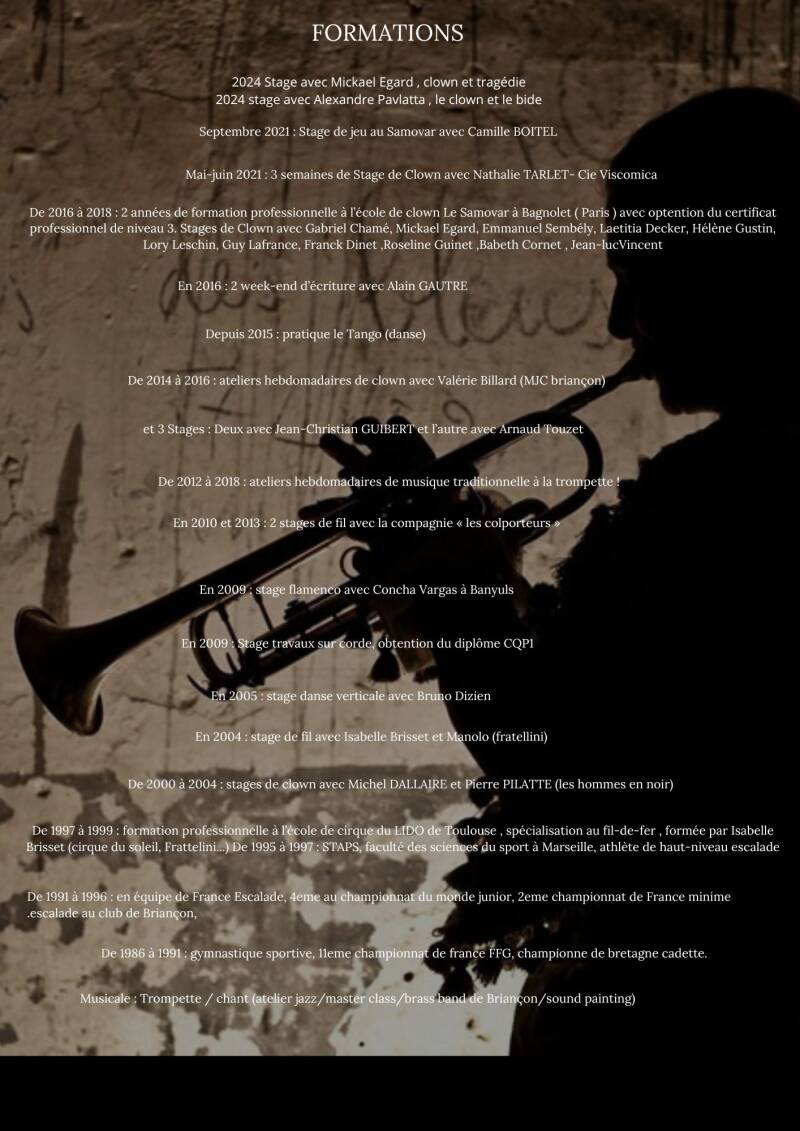 Après 20 ans comme acrobate, fil-de-fériste, trapéziste et voltigeuse au tissu aérien dans différentes compagnies (notamment Cie Contre-pour, le cirque Gosh, Circ Panic, Envol Distratto, Décor Sonore), je décide de me diriger plus intensément vers le clown car, comme on dit, c'est ce que font les vieux acrobates après leur vie de performance. Je me suis formée à l'école de clown du Samovar à Bagnolet pendant 2 ans où j'ai trouvé la base de mon clown pour partager du rire, de la rigolade et toucher le public au cœur, à travers mes spectacles .
